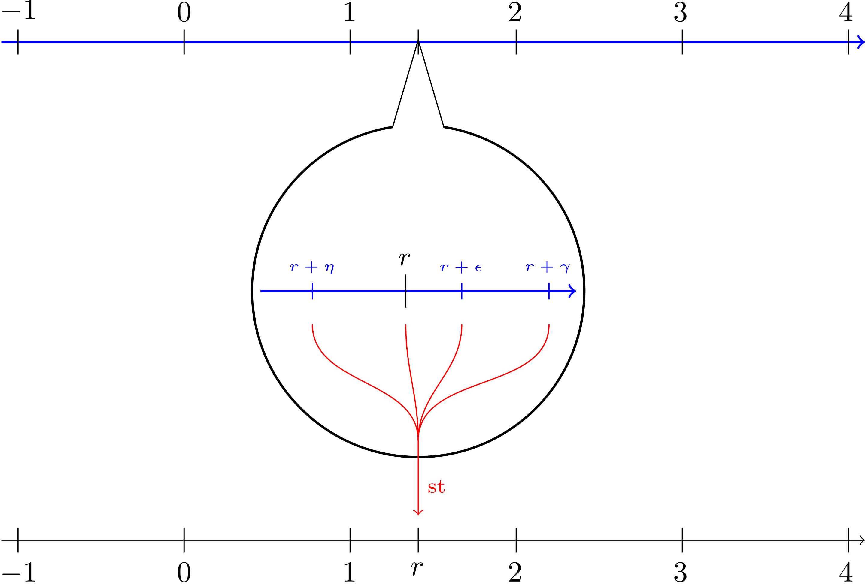 Now rather than a dual space, you may think of a fundamentally nonstandard function. Its domain or range (or both) are nonstandard. And unlike a generalized “function”, it’s a bona fide function, just not over the reals1. For the rest of this post, I will call the usual generalized functions “generalized functions” and this concept “nonstandard functions”. This class of nonstandard functions includes the generalized functions, but is bigger. Rather than cutting down the space of functions to a smaller space, we’re enlarging the space of numbers and functions between them.