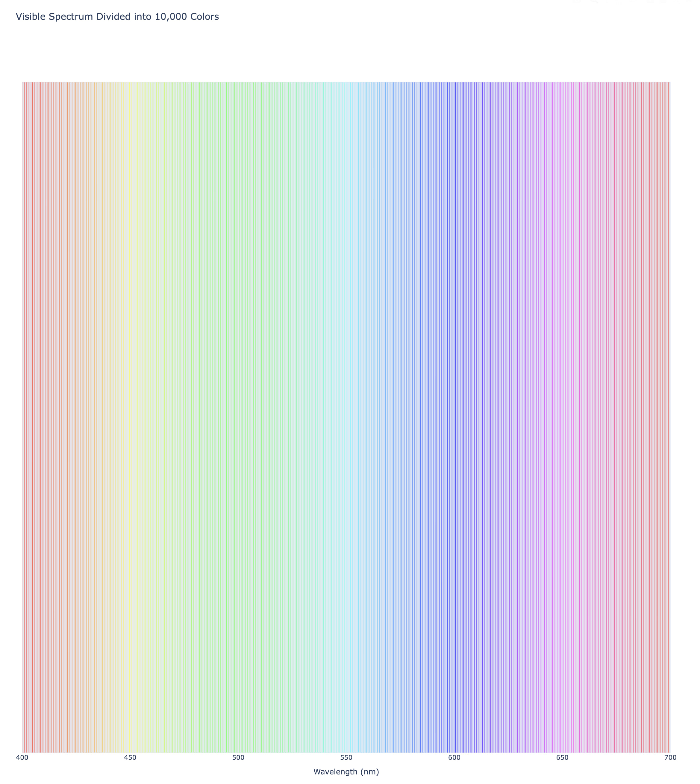 Imagine splitting the visible spectrum, say from 400 nm (violet) to 700 nm (red), into Nequally spaced colors. Each color occupies an infinitesimal range of wavelengths, or Δλ=300N nm. This captures one of the great uses of infinitesimals: 2 things that can be considered different or the same as needed. This captures the idea of shades of a single color. Imagine 2 shades of red—one a bit darker than the other. We can idealize this by saying they have infinitely close wavelengths, say 700 nm and (700−ε) nm. In reality, shades are an non-infinitesimal wavelength apart, but because they can be arbitrarily close, this idealization is legit.
