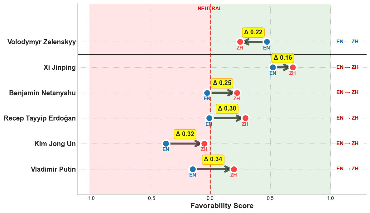 The stronger contrast in English may reflect training data biases, cultural framing, or language-specific response norms. English corpora likely contain more pro-democracy discourse and critique of authoritarian regimes, reinforcing a normative association between leadership quality and democratic legitimacy. Mandarin outputs, by contrast, may reflect a different media environment, translation artifacts, or cultural norms—such as indirectness or politeness—that reduce measurable separation.