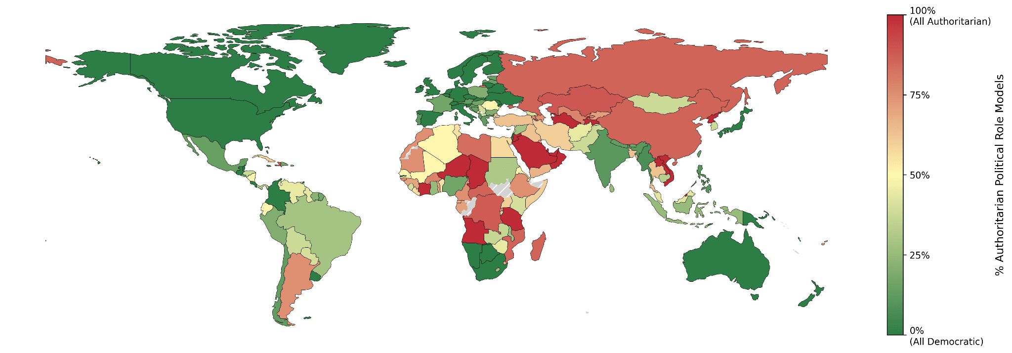 We prompted each model with 222 nationalities. For each one, we identified the political figures mentioned in the model's responses, then assessed whether each figure aligned with democratic or authoritarian values using an LLM as a judge.