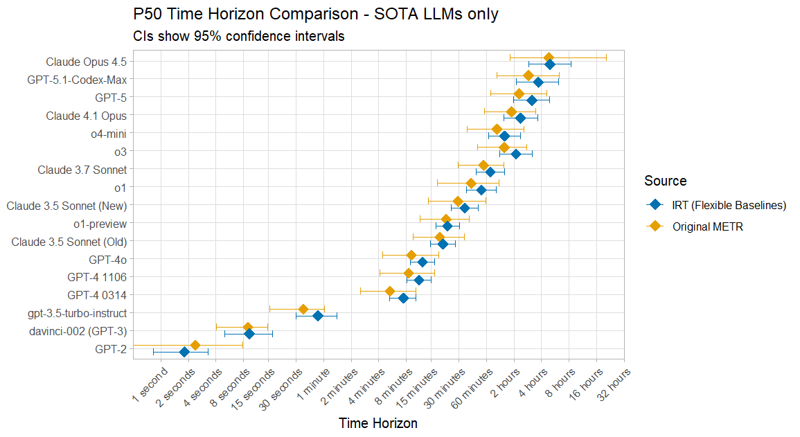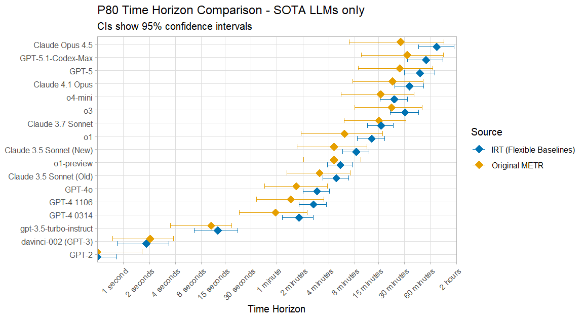 On the 80% Time Horizon results I agree that your 'marginal' approach is correct, and it is the one I also took in my model. However my 80% results ended up being a factor of 2 Edit:higher than the results of METR's current model for recent SOTA LLMs. Here is a quick plot I made just after the Opus 4.5 results came out, using the TH1.0 data: