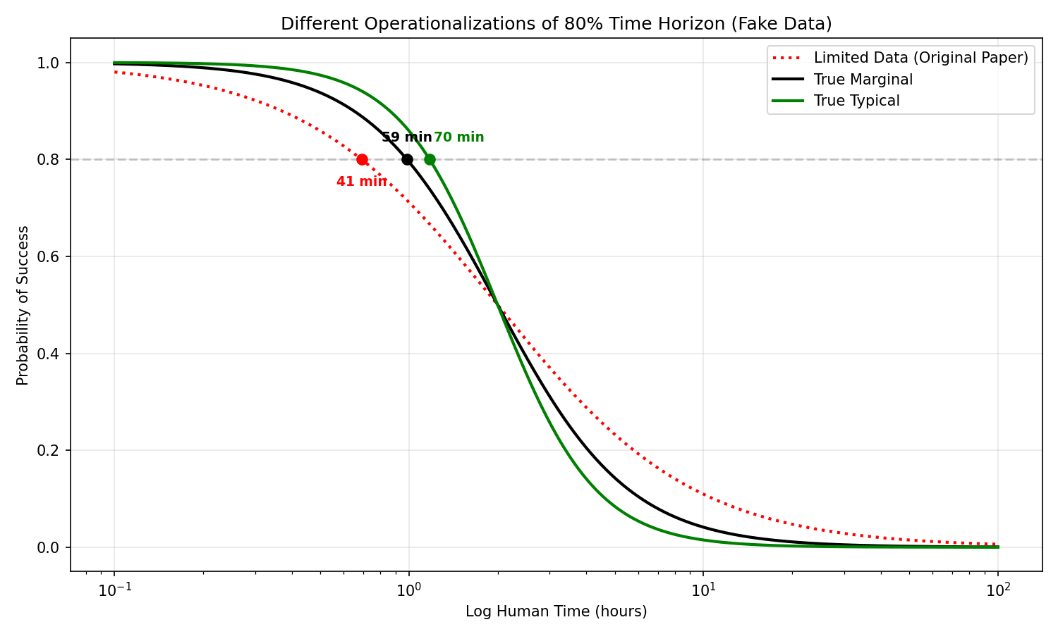 Our method is actually closer to computing "Marginal", because when fitting the logistic curve, the points near x = 1 hour include all trials for all tasks estimated at that length. We didn't actually have the means to get the "Typical" 80% point since we don't compute "average difficulty for its length" anywhere.