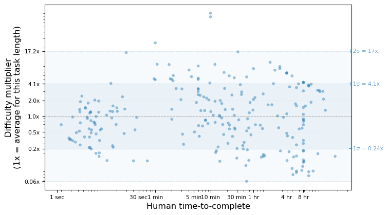 A plotted dot at 5x means the task’s equivalent difficulty time is 5x its actual human time. Even within the band, tasks of