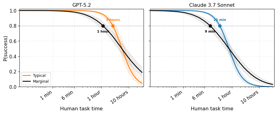 The marginal horizon is the one that matters for practical purposes. “Typical” is optimistic since it only considers tasks of average difficulty for their length. The marginal accounts for the full spread of tasks, so it’s what you actually care about when predicting success on a random task of some length. That said, from the plot we see frontier performance of roughly 6 minutes, which does sound sort of short to me. I’m used to LLMs roughly one-shotting longer tasks than that, but it usually takes some iterations to get it just right. Getting the context and subtle intentions right on the first try is hard, so I’m willing to believe this estimate is reasonable.
