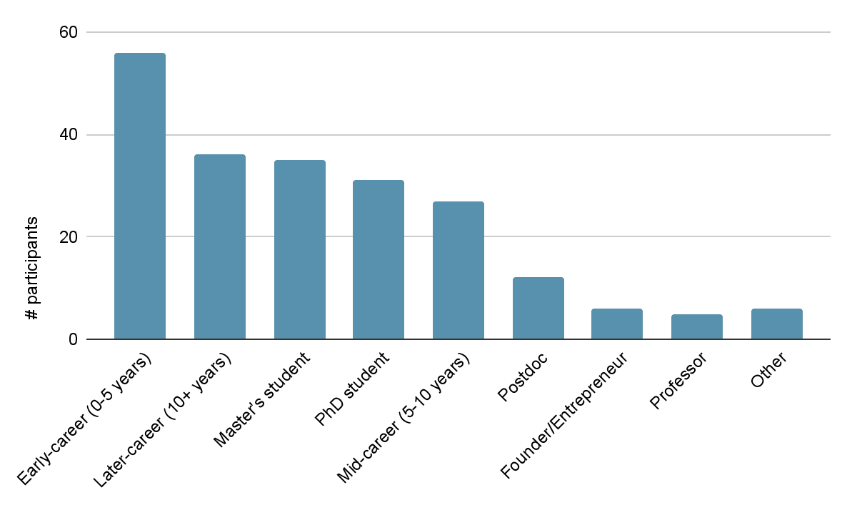The above graph shows the actual distribution of what people reported as their experience level. The ones reported as professional researchers are effectively people new to AI safety. With 36.5% of newcomers, we approximately reached the target of having 40% of participants new to the field. The representatives of AI safety orgs reported a good balance in the experience of the people they talked to. In the same context, the conference was also joined by people of very diverse career stages, with only 25.5% of participants being part of the biggest career stage (early-career professionals) (see graph below for career stage categories).