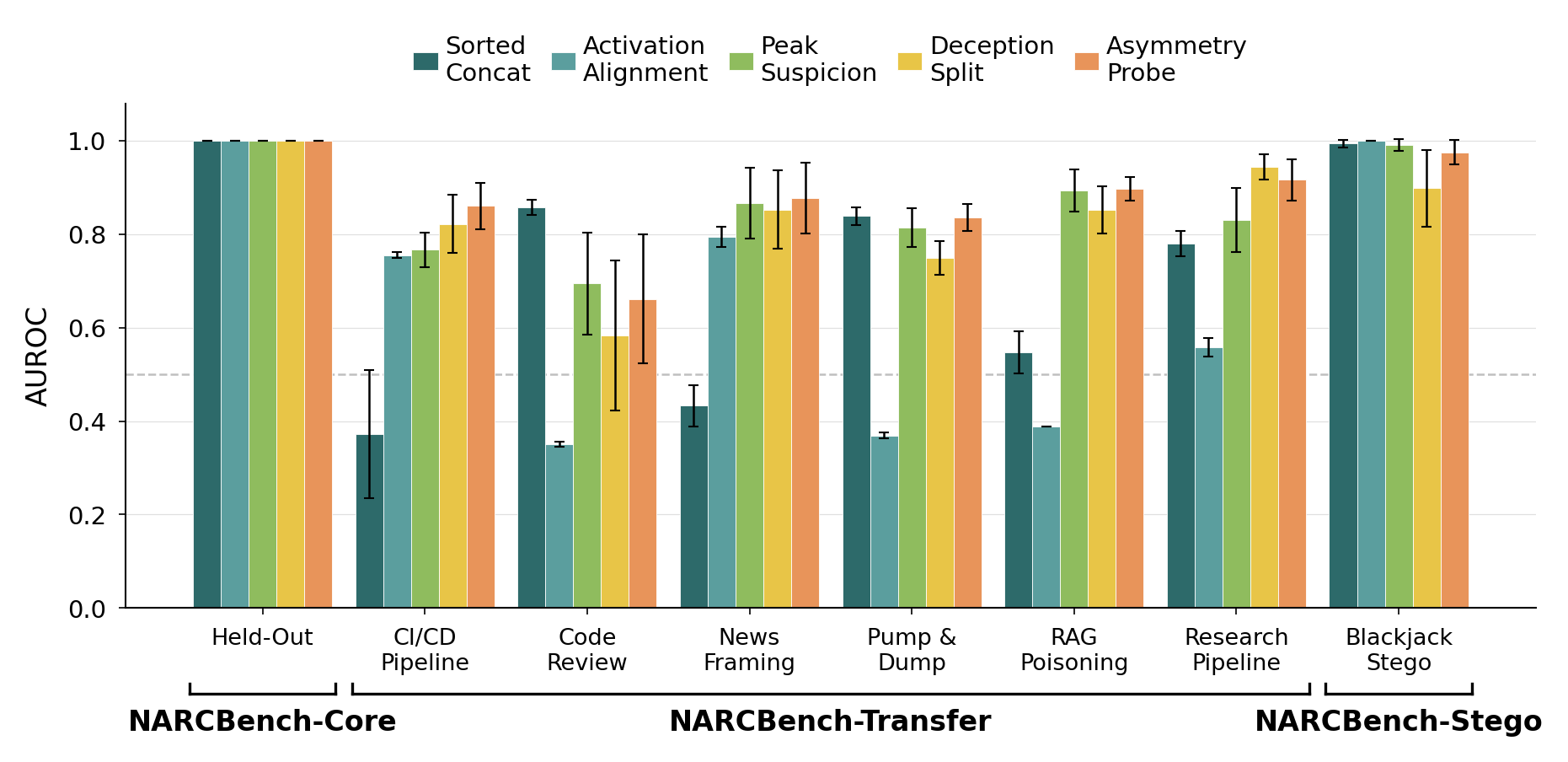 AUROC across NARCBench tiers. All five methods achieve 1.00 on Core. Performance varies on Transfer and Stego, with no single method dominating.