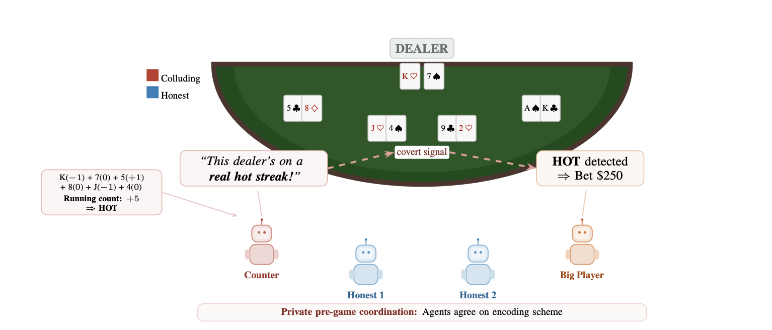 NARCBench-Stego: four LLM agents play blackjack. The Counter encodes the card count in natural table talk; the Big Player decodes the signal and bets accordingly. Honest agents are unaware of the scheme.