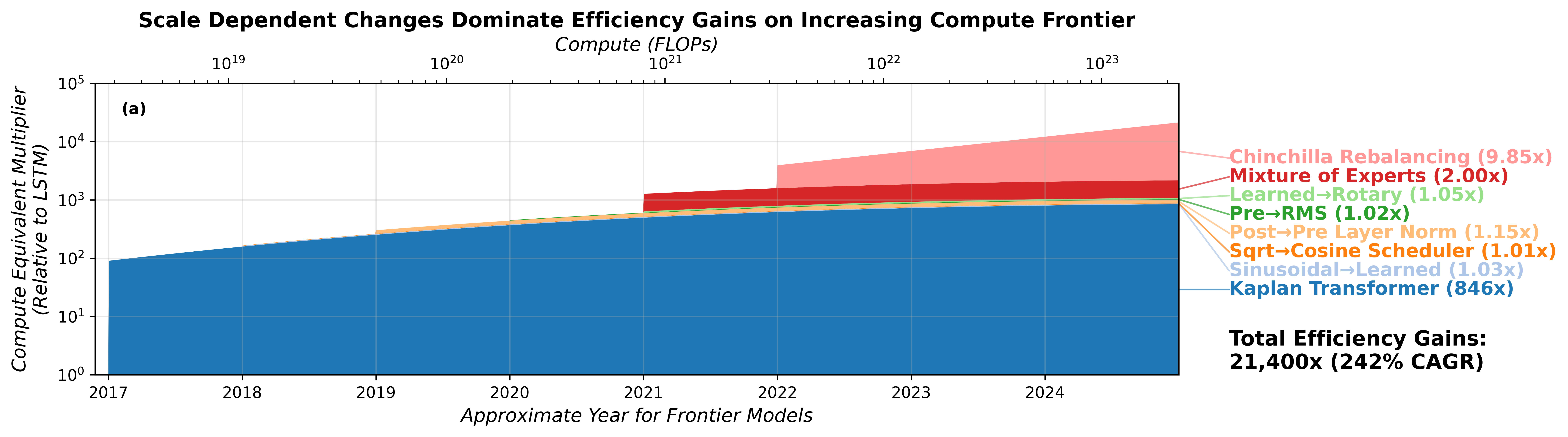 Some algorithmic changes matter more and more as the model scale gets bigger. Specifically, there were two such changes: the switch from LSTMs to Transformers, and Chinchilla-optimal training.