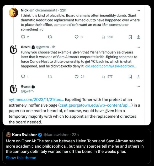 Sam Altman then attempted to use this (potentially manufactured) drama to get Toner removed from the board. He used a similar tactic at Reddit, a manufactured crisis to force others to give up power. Once Toner was gone, presumably Altman would have moved to reshape the rest of the board.
