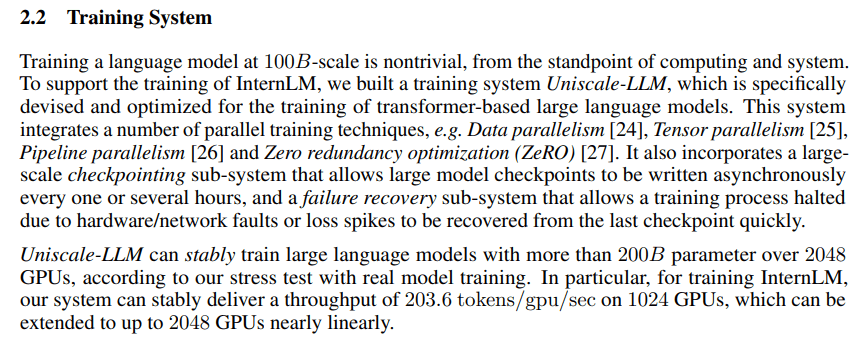 A technical report of InternLM on 6/7. It consisted of 104 billion parameters, was trained on 1.6 trillion tokens, and was fine-tuned for performance in Chinese.