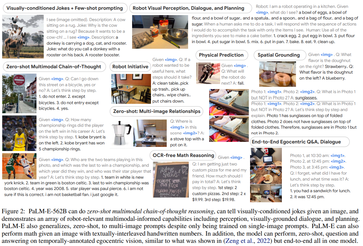 Among works that output actions, perhaps most similar is the approach proposed in Gato (Reed et al., 2022) which, like PaLM-E, is a generalist multi-embodiment agent. In contrast to Gato, we demonstrate positive transfer across different tasks where the model benefits from diverse joint training across multiple domains. [...]