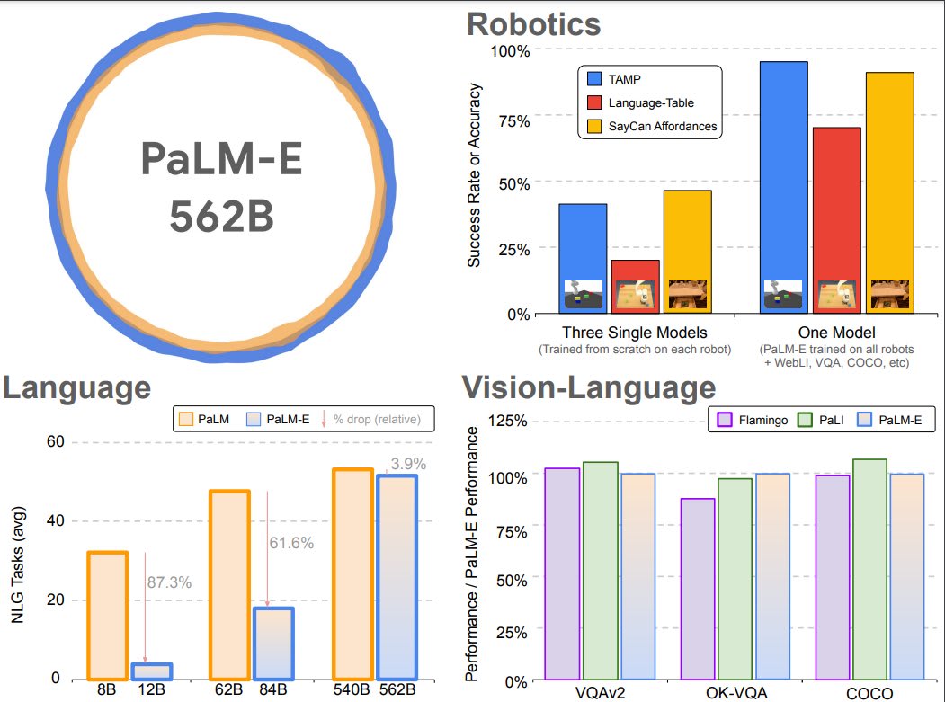 Generalist vs specialist models – transfer. As summarized in Fig. 3, we have shown several instances of transfer in this work, meaning that PaLM-E trained on different tasks and datasets at the same time leads to significantly increased performance relative to models trained separately on the different tasks alone. In Fig. 4, co-training on the “full mixture” achieves more than double the performance. In Tab. 9, we see significant improvements in performance if we add LLM/ViT pre-training, and training on the full mixture instead of the mobile manipulation data alone. For the Language-Table experiment in Tab. 2, we observe analogous behaviour.