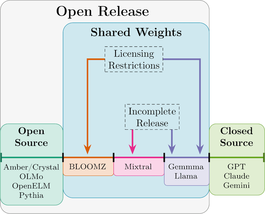 Shared Weights models – Describes all AI models which released their weights in some low-barrier capacity. Most current models claiming to be open source fall into this category.
