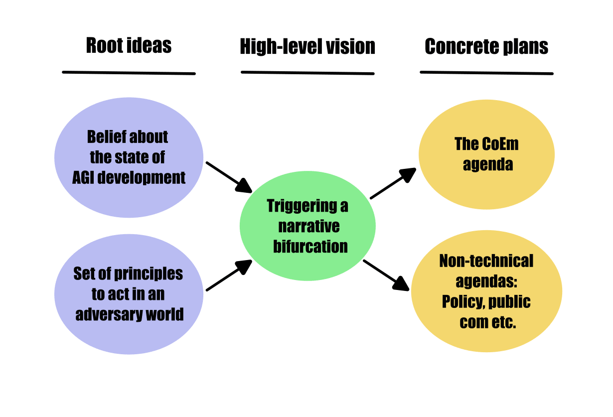 I found that the technical agenda was not a stand-alone, but along with beliefs about the world and a non-technical agenda (e.g. governance, communication, etc.), it fits in in a broader vision that I called triggering a narrative bifurcation (see the diagram below).