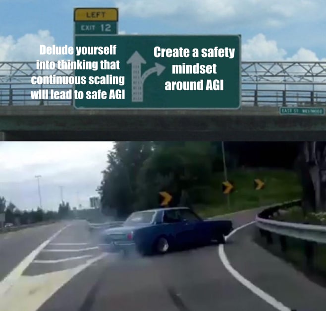 Continuing on the default path is an unacceptable level of risk. Even with the best effort to steer it on the technical and governance and technical side, the set of unchallenged assumptions it conveys with it (unstoppable progress and larger black boxes) removes any hope for ending in a safe world.