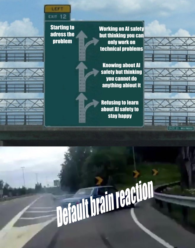 The default reaction to a human confronted with the AGI x-risk meme is a series of “near misses”. Successive steps of understanding the risk, the relationship between technological solutions and governance, and what action they can take. At every stage, the individual has the impression that they know about the problem, sometimes that they act accordingly while in fact having missed crucial information that prevents them from efficiently tackling the problem.