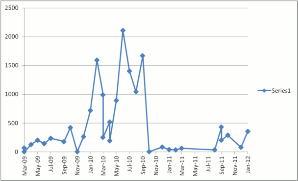 I did a search for Open Threads, and entered all the monthly ones I could find into an Excel spreadsheet. I made them into a graph, and I discovered an anomaly. There was an 8-month timespan from February 2010-September 2010, in which the comment counts were extremely high (up to 2112). Many of these threads had 2, 3, or 4 parts, because they were getting filled up.