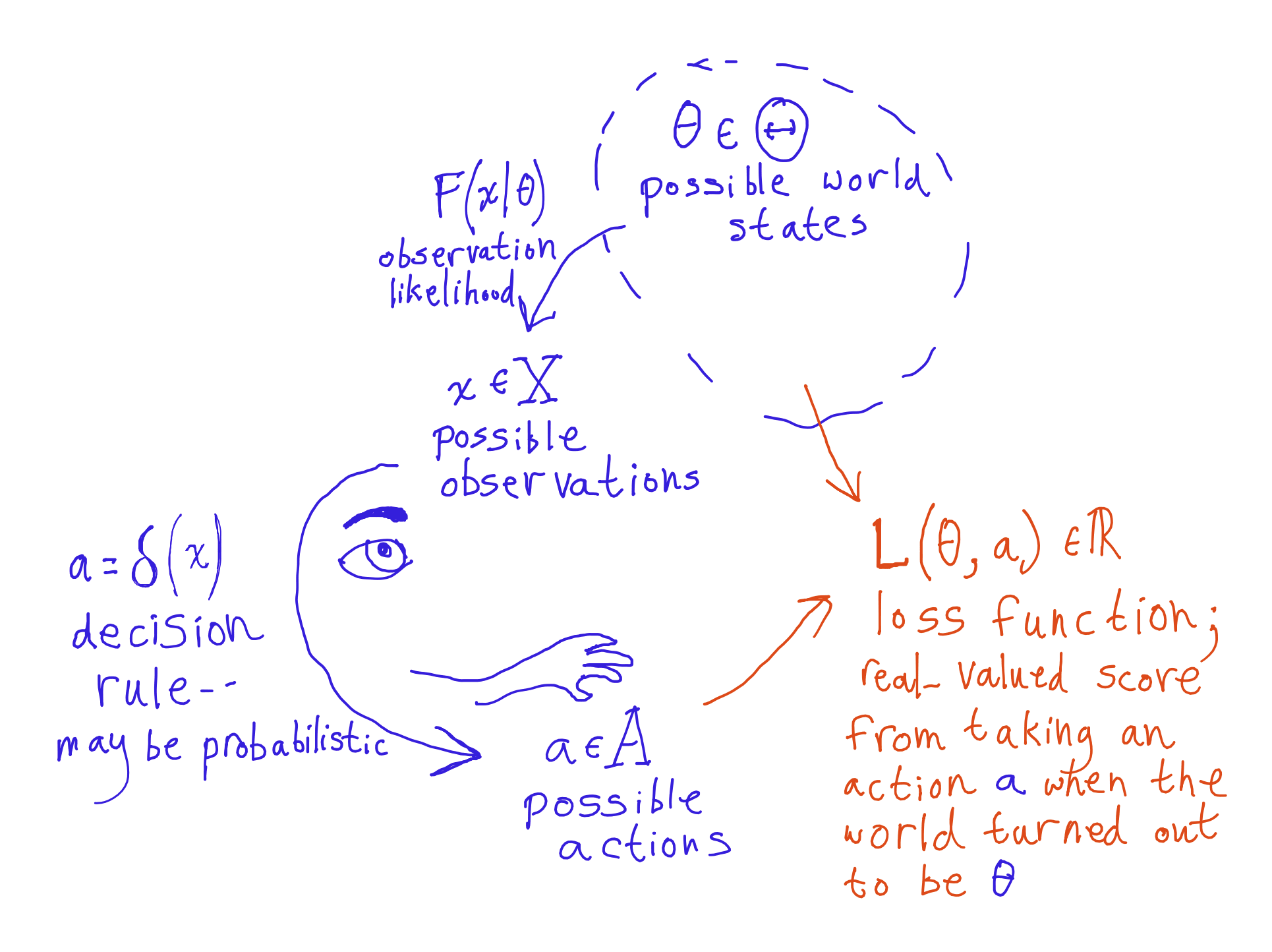 If we drop the observations, we can interpret the θi as people, and the A as potential collective actions. The δ are potential social choices, which are admissible when they are pareto-efficient with respect to individual's preferences.