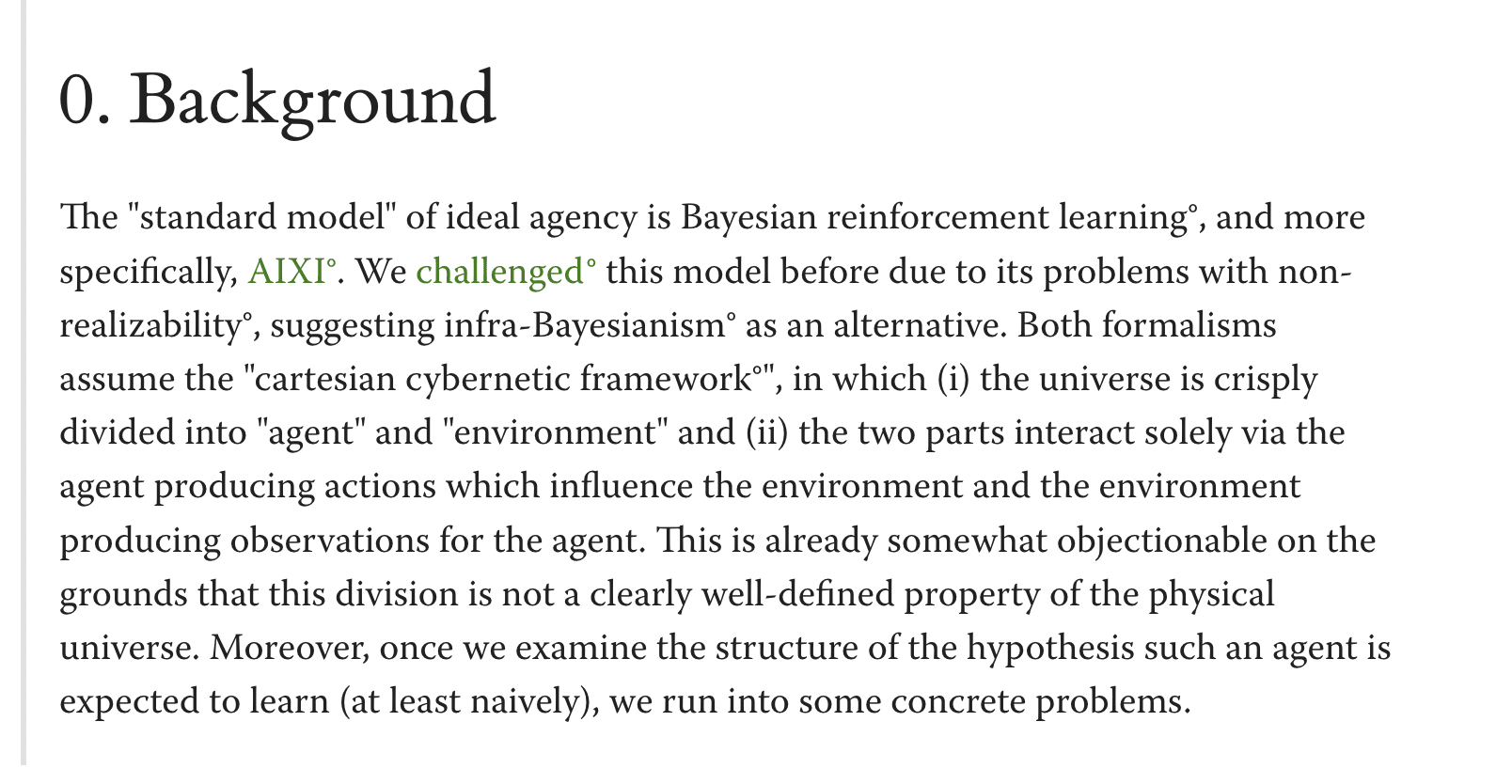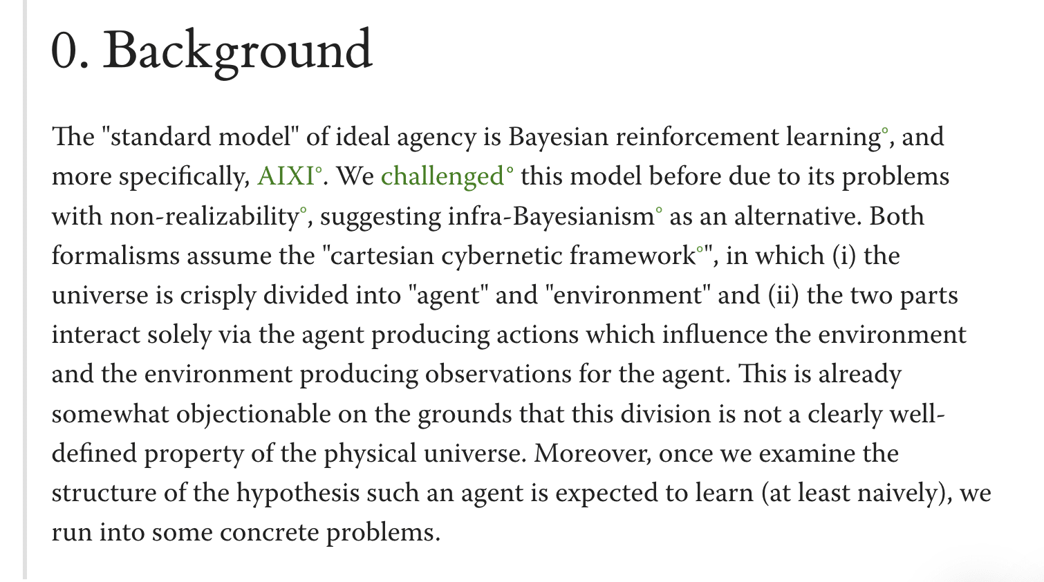 The "standard model" of ideal agency is Bayesian reinforcement learning, and more specifically, AIXI. We challenged this model before due to its problems with non-realizability, suggesting infra-Bayesianism as an alternative. Both formalisms assume the "cartesian cybernetic framework", in which (i) the universe is crisply divided into "agent" and "environment" and (ii) the two parts interact solely via the agent producing actions which influence the environment and the environment producing observations for the agent. This is already somewhat objectionable on the grounds that this division is not a clearly well-defined property of the physical universe. Moreover, once we examine the structure of the hypothesis such an agent is expected to learn (at least naively), we run into some concrete problems.