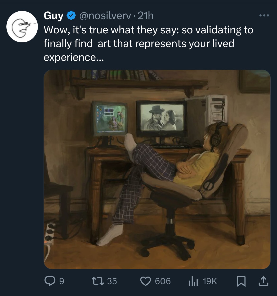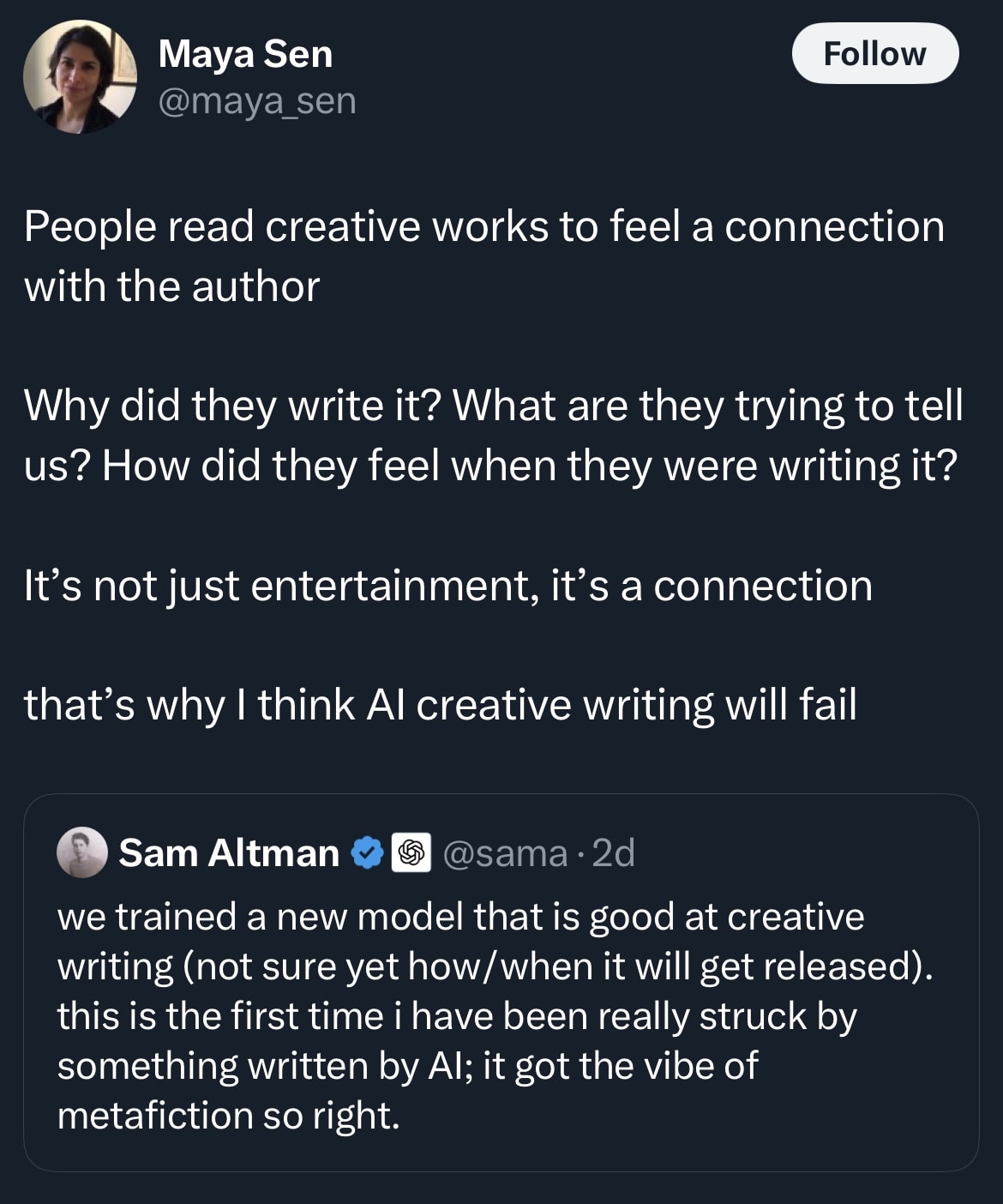 There's a kind of sad objection that's like: you can't distinguish AI-generated art from human-generated art, so every time you encounter a piece of art that validates your own experiences, there is always a chance that it was human-made. (See my forthcoming post on adversarial Turing tests.)