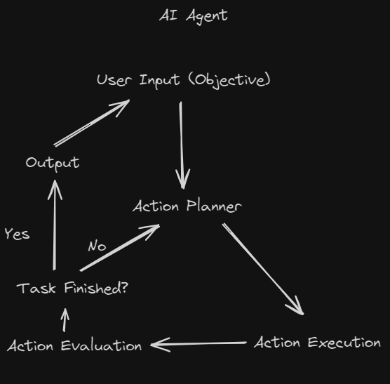 Notice that AI agents are fundamentally a loop. Action Planning → Action Execution → Action Evaluation. This means that agents can accomplish many subtasks before stopping.