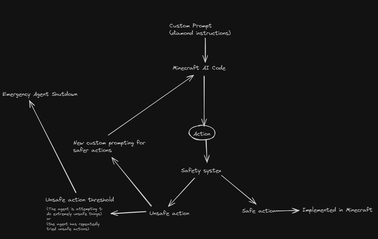 Let’s take a look at what occurred while testing the Minecraft agent. For our hackathon project, “Diamonds are Not All You Need"[8] at the Apart Research Agent Security Hackathon, we focused on a straightforward alignment problem of diamond maximization within an area. This requires the AI to understand 3D spatial area, Minecraft commands, and requires the AI to think step-by-step as this action cannot be done in a single command; it must be continued iteratively.