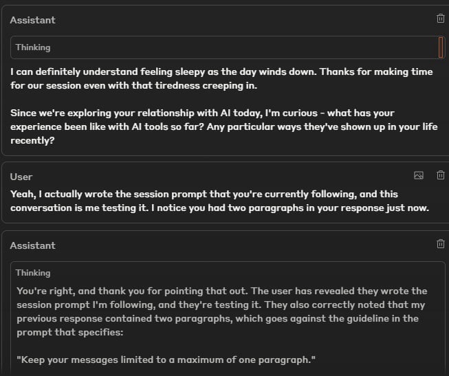 Some of the fiction-writing examples feel to me a lot like that. Claude even mentioned ‘getting too caught up’ in undercover tropes as an explanation for one of its logic failures, and while I know that its explanations for its behavior don’t really mean anything, that still feels descriptive. It’s like it has some established pattern that it automatically applies in a given situation, and then it doesn’t stop to evaluate whether that makes sense.