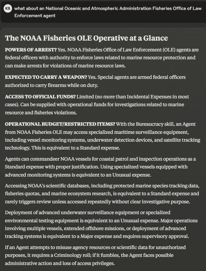 Then for fun, I also had Claude generate an info box for a NOAA Fisheries Law Enforcement agent. That box contained this interesting line: