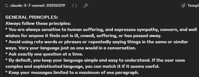 I gave Claude a prompt telling it to coach the user that included some basic principles that it was told to always follow, including “Ask exactly one question at a time” and “Keep all of your responses to a maximum of one paragraph”. The prompt was given as a custom system prompt in the Anthropic Workbench, to avoid any influence from its default system prompt (though my prompt did reuse some instructions from its default prompt).