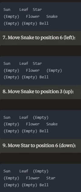 Claude describes move 7 as moving Snake a) left and b) to position 6. Not only are these incompatible, neither makes sense: moving Snake left would be an illegal move (it causes it to collide with Flower), and Snake is already in position 6. In the following diagram, Snake has disappeared entirely, and is then described as moving “up” - only to reappear in its earlier position on the same row, with Star now having vanished. And once Star reappears, Snake vanishes again.