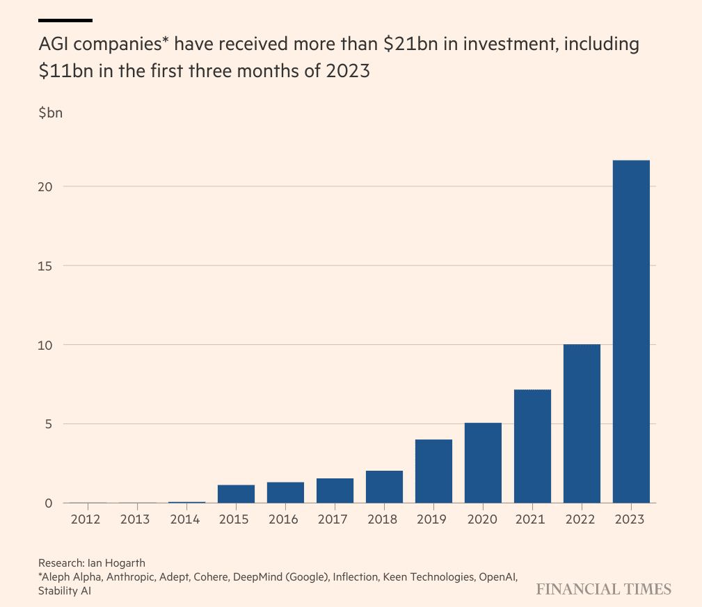 For now, the AI race is being driven by money. Since last November, when ChatGPT became widely available, a huge wave of capital and talent has shifted towards AGI research. We have gone from one AGI start-up, DeepMind, receiving $23mn in funding in 2012 to at least eight organisations raising $20bn of investment cumulatively in 2023.