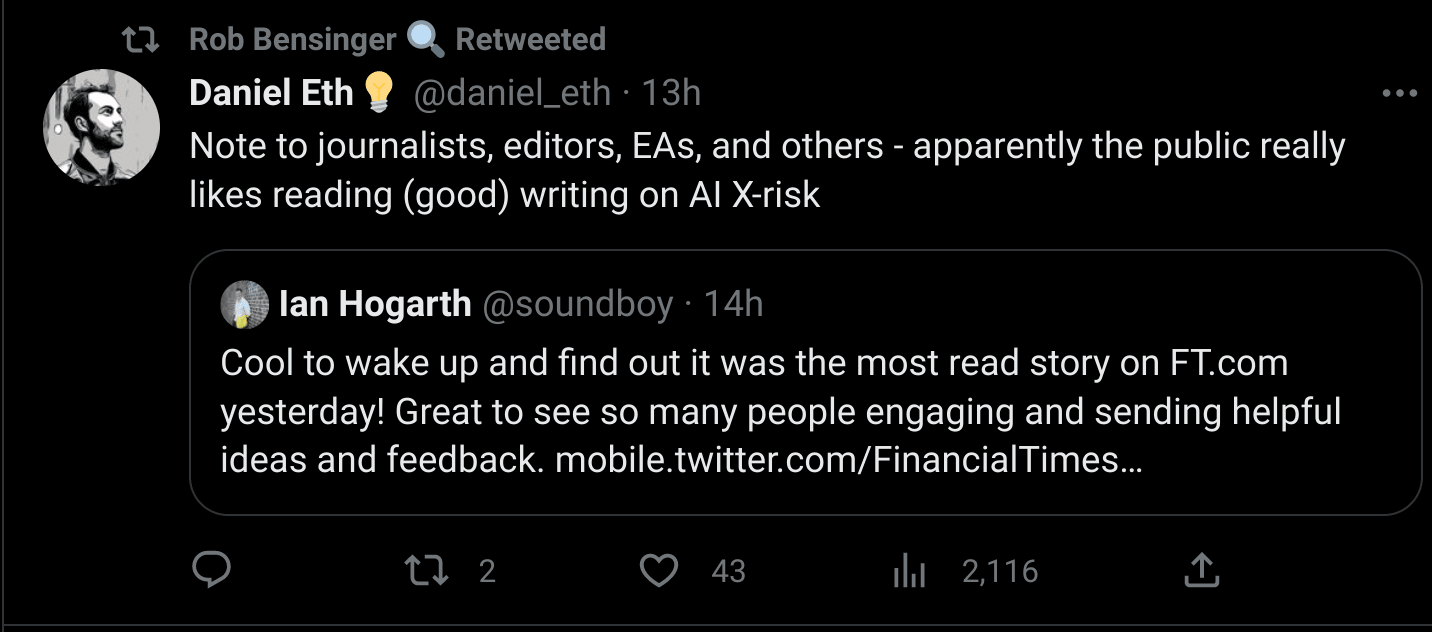 That's actually really interesting, can you go more into it? I think it's pretty relevant to this moment in history (I don't know much about FT), it was a pretty big moment, since this AI risk article was allegedly the most viewed article on FT, possibly for the entire day, and I personally remember it being unusually close to the top of the page, and with a very eye-catchy image.