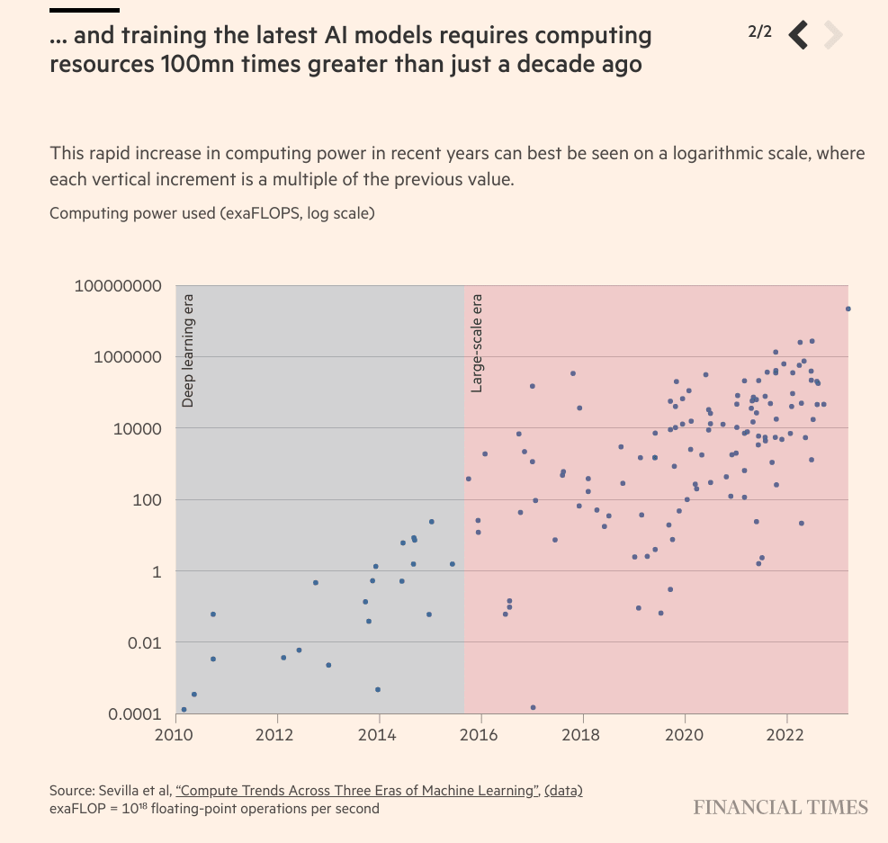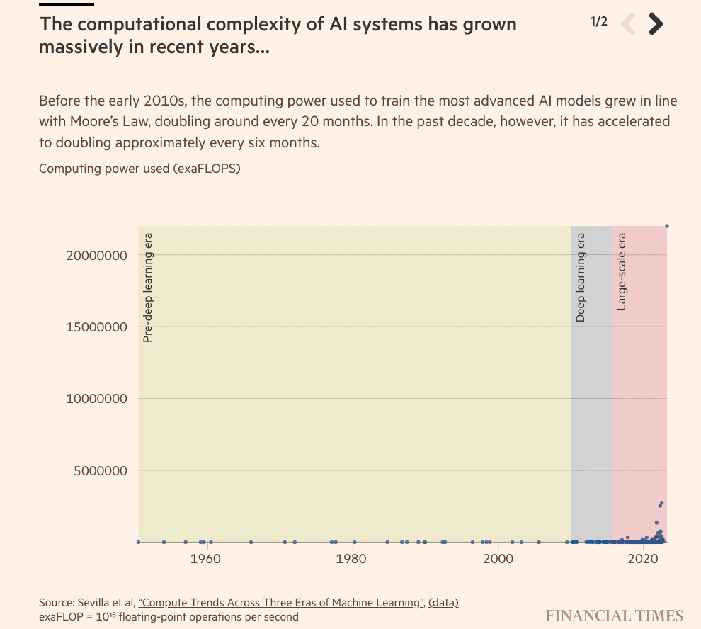 The graph below illustrates how the compute used by the largest models has changed since the field began in the 1950s. You can see an explosion in the past two years.