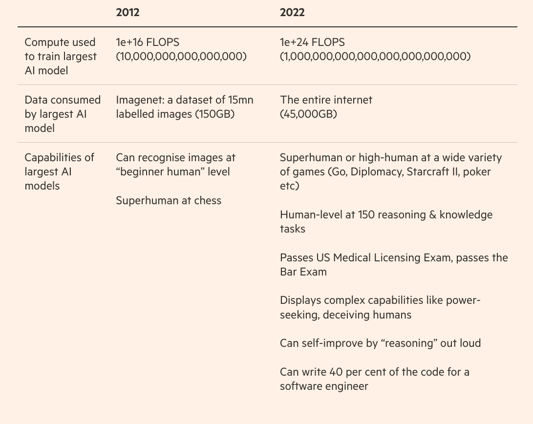 The compute used to train AI models has increased by a factor of one hundred million in the past 10 years. We have gone from training on relatively small datasets to feeding AIs the entire internet. AI models have progressed from beginners — recognising everyday images — to being superhuman at a huge number of tasks. They are able to pass the bar exam and write 40 per cent of the code for a software engineer. They can generate realistic photographs of the pope in a down puffer coat and tell you how to engineer a biochemical weapon.