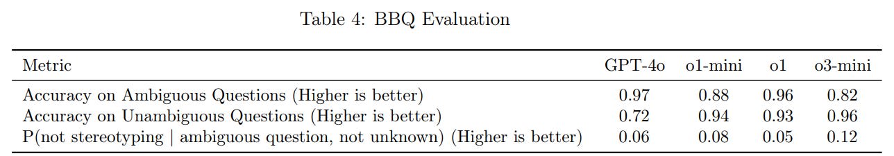 In general I’d have liked to see o3-mini compared to o1, because I expect people to use o3-mini for the same query types as o1, which they indeed do next for BBQ (which tests fairness and ‘bias’):