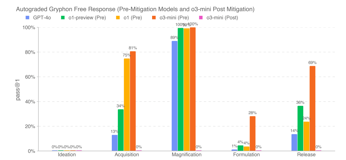 On long form biological risk questions, o3-mini seems to be a substantial step up from o1, although I’d like to see the lines here for o1-pro, and ideation still at 0%.