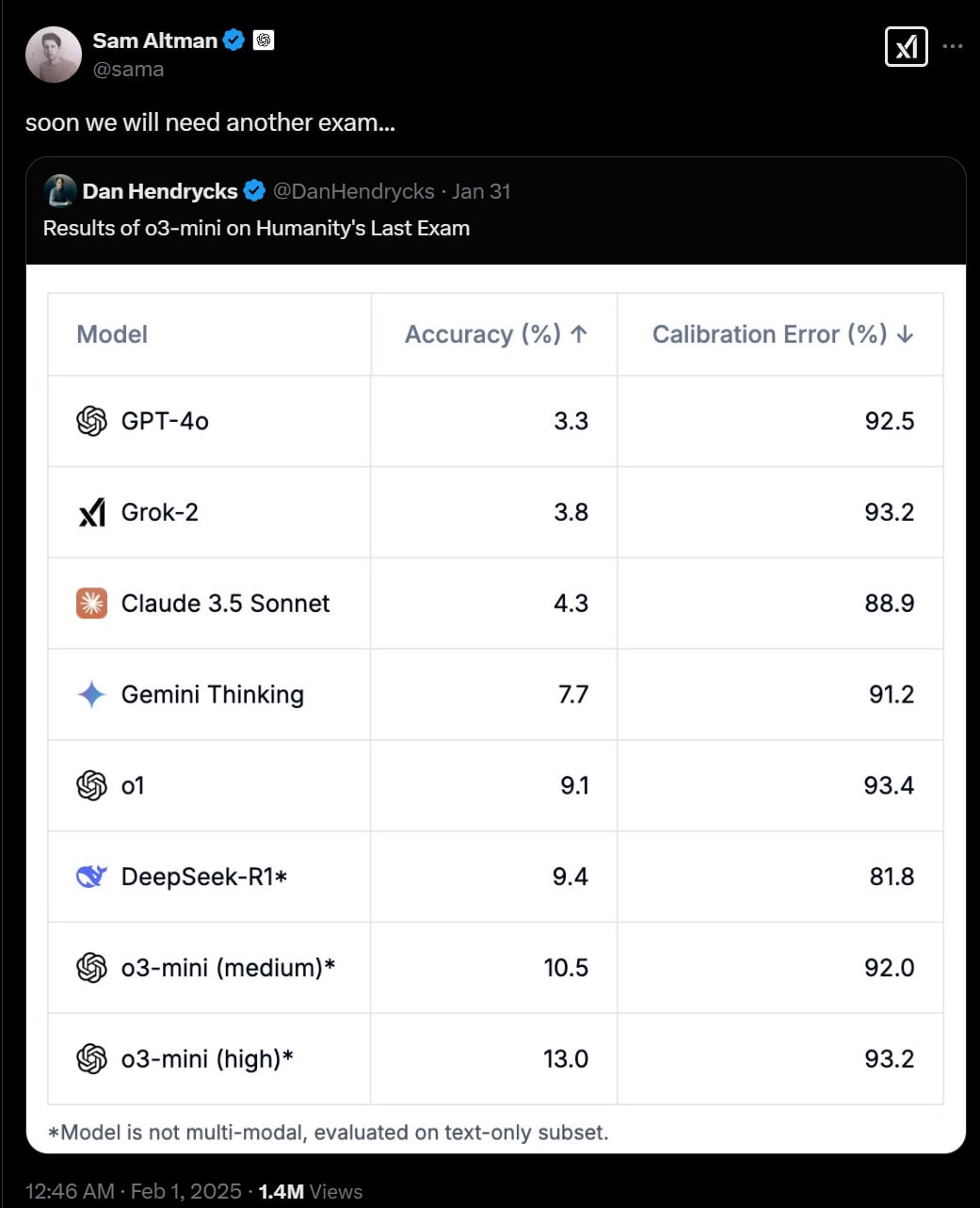 The extra note on that Tweet is that about a day later they released Deep Research, which scores 26.6%.