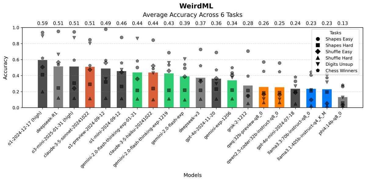 Harvard Ihle: Updated results on WeirdML, including o3-mini, o1, R1 and the new flash-thinking. O3-mini comes in at the same level as R1, a bit behind o1.