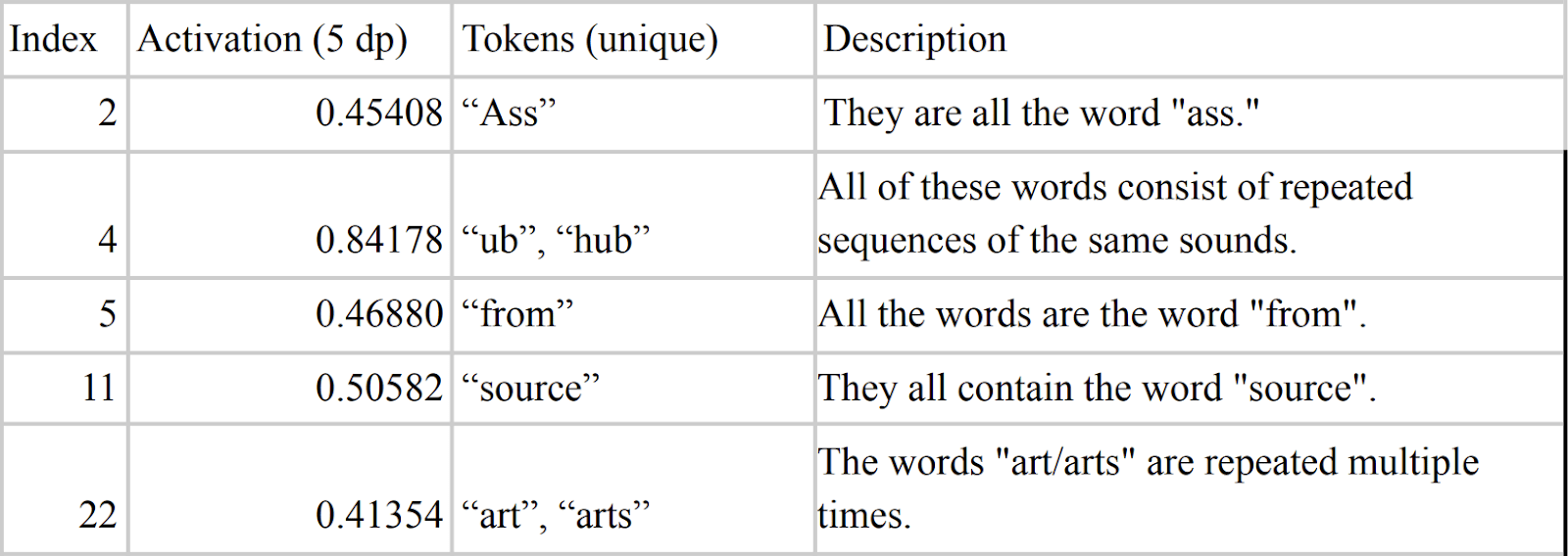 With the significantly semantically activating neurons and their top tokens, GPT-3 can then be used to describe the similarity between the tokens for each neuron, leading to a human-understandable and highly-compressed understanding of the semantic encoding of a neuron. Each token has a 7 token symmetrical context window that enables this description.