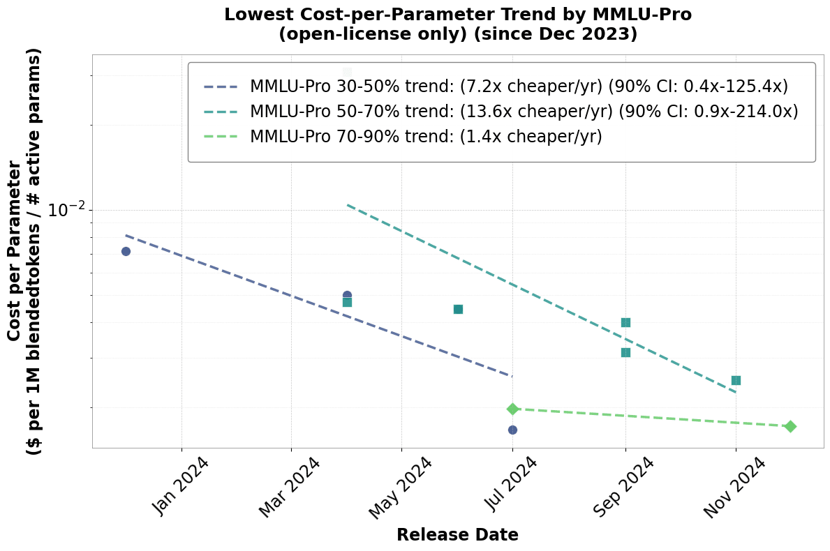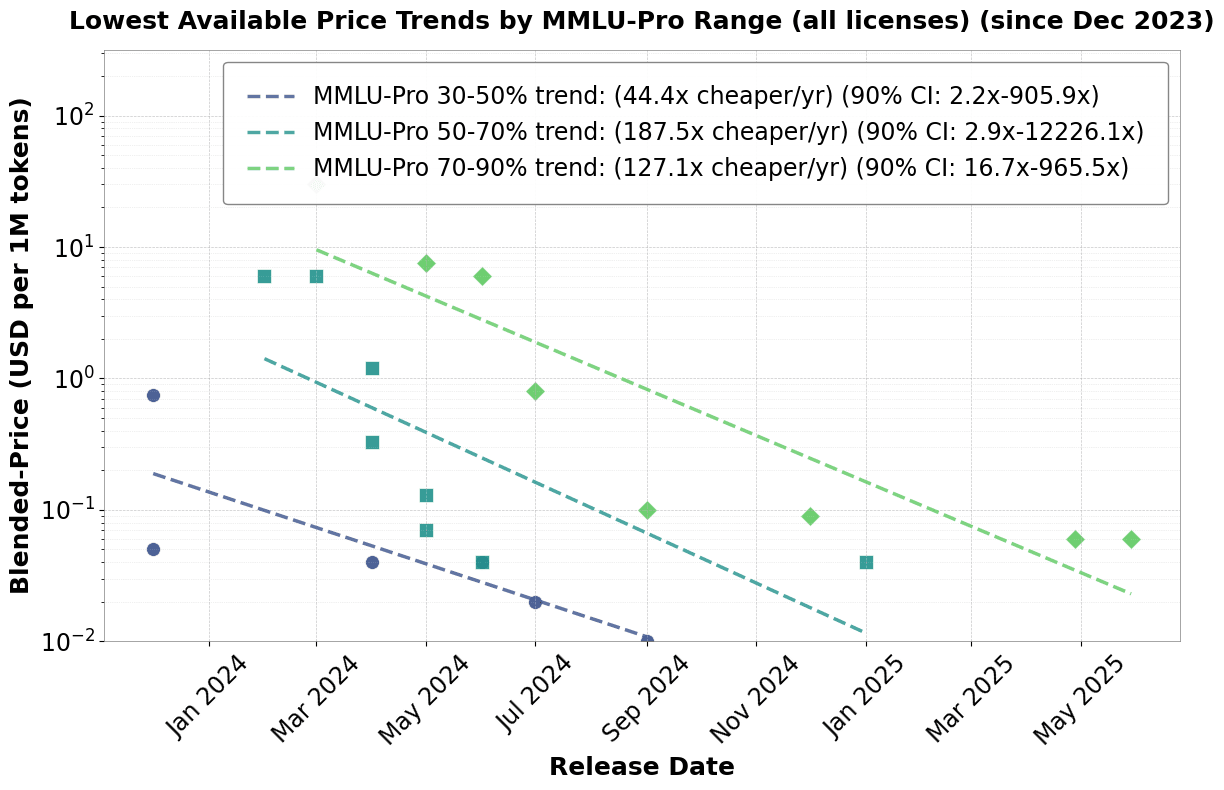 We choose to fit a model on the lowest-available-prices/record-low-price models in three MMLU quality levels in order to capture the efficiency frontier (i.e., models that had a lower inference price than any previous model at a given quality level). This can be seen in Figures 1 and 2 for all models and open source models, respectively. Specifically, we regress the lowest blended inference price at a given MMLU-Pro level (ie, 30%-50%) by time to get a trend in each MMLU quality group. We separate the models into MMLU-Pro performance bands to control for model quality. We take the lowest prices in each band to ensure we are measuring the most efficient models. Many models may not be broadly used commercially but are present for prestige or research, or used for distillation and speculative sampling, and thus do not have model efficiency as a major objective. The trend in model prices using all models at a given quality level is significantly smaller. We do not quite know why this is the case in a competitive open-source market. Possibly this is due to the multidimensional performance of models, where an AI may have a lower MMLU-Pro score but higher coding capabilities. However, this is not a significant factor identified in our Method 2 tests.