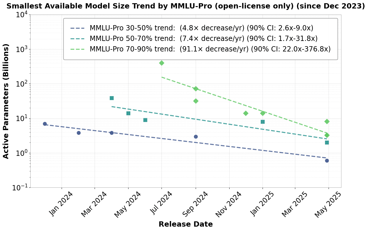 Fig 3: Trend in the lowest number of active parameters for a given MMLU-Pro quality. This is a better metric for algorithmic inference progress in terms of strict inference FLOP numbers. However, there is a large divergence between high and low quality models. Data taken from Artificial Analysis.