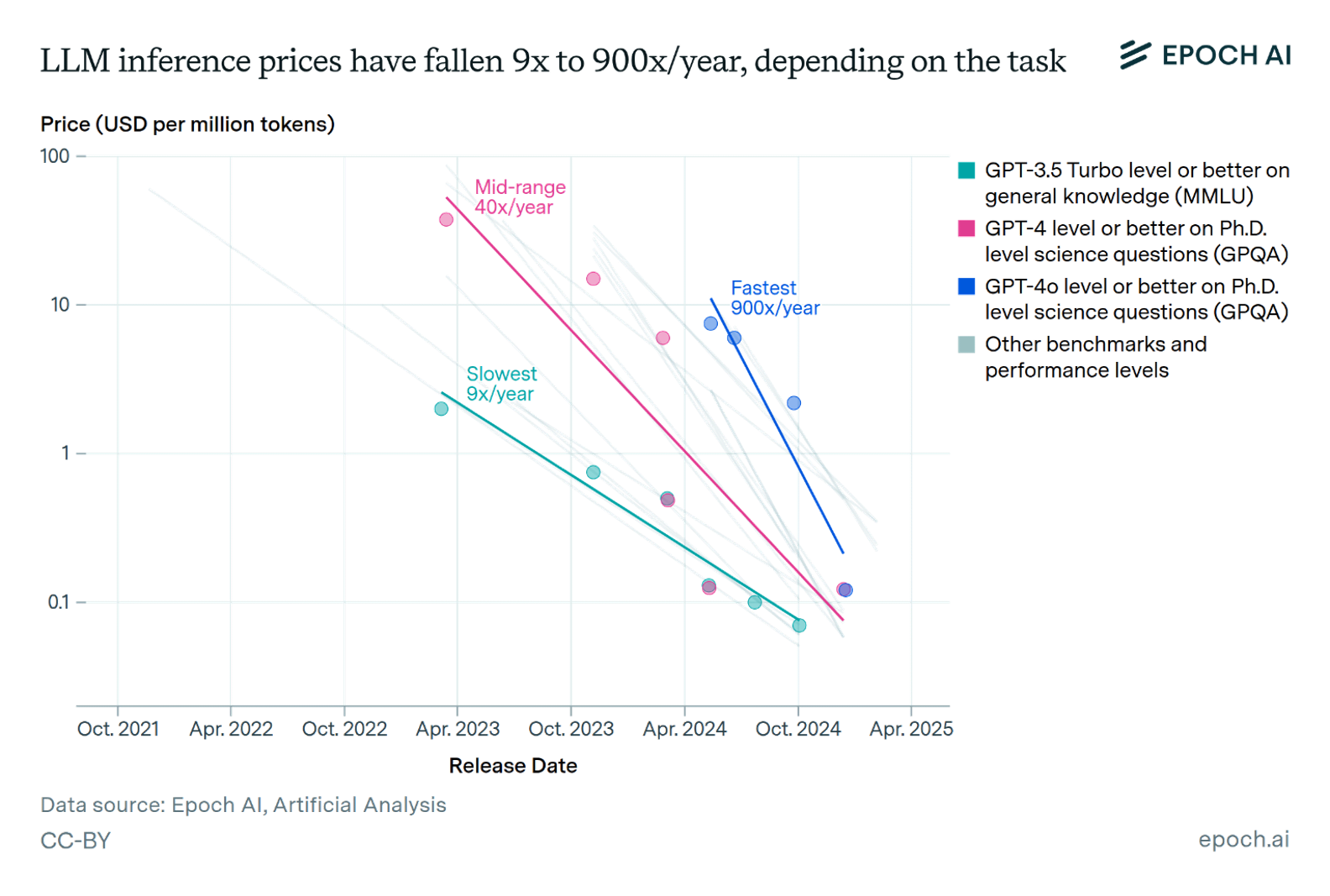 Despite this mess of confusion, one fact seems clear: the price for model inference for any given task is falling at an astonishing rate, due to a combination of Moore’s law, hardware and software optimization, better models, distillation, etc. Of course this won’t go forever, but in the short term it seems a consistent fact that once AI is capable of doing some task, it will then quickly become much cheaper.