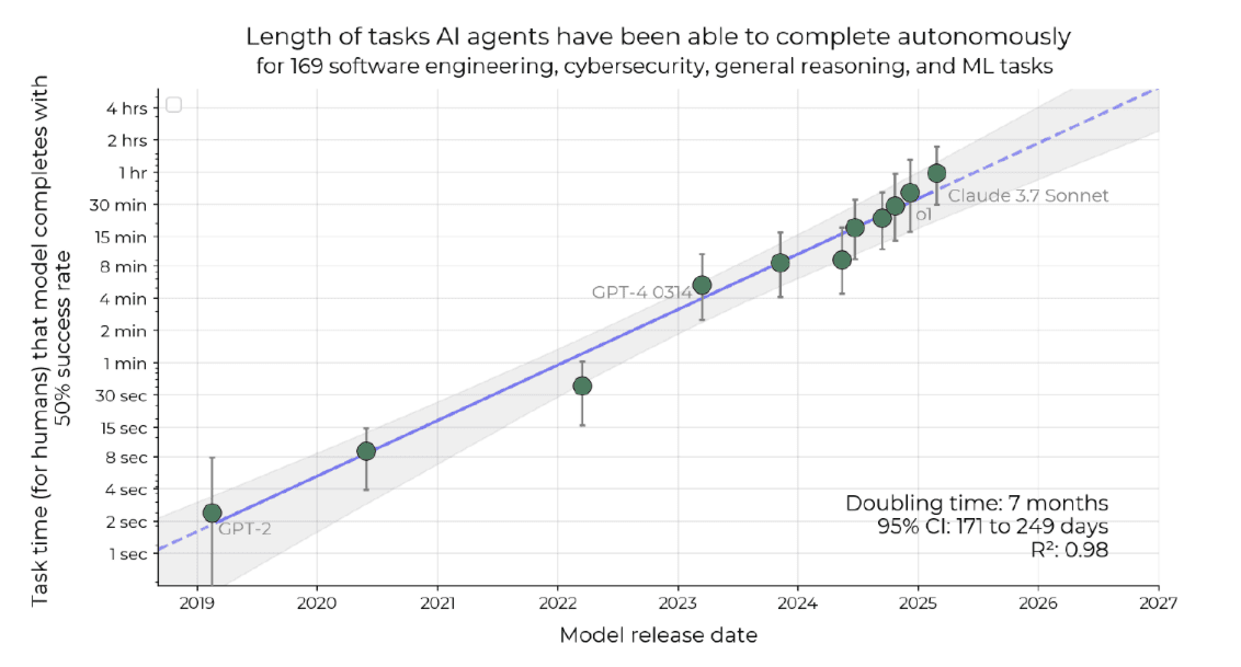 The article’s bottom line is that AI’s task horizon has doubled every 7 months since 2019. Today, frontier models can handle ~1-hour tasks; by 2030, they may tackle month-long projects, unlocking vast productivity but also raising profound safety risks.