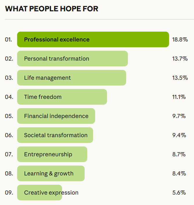 “Personal transformation”—using AI to help one grow or improve their wellbeing as a person—also appeared frequently (14%). Within this category, the desires were diverse, ranging from cognitive partnership and collaboration (24%), to support with mental health (21%) or physical health (8%), and even romantic connection with AI (5%).