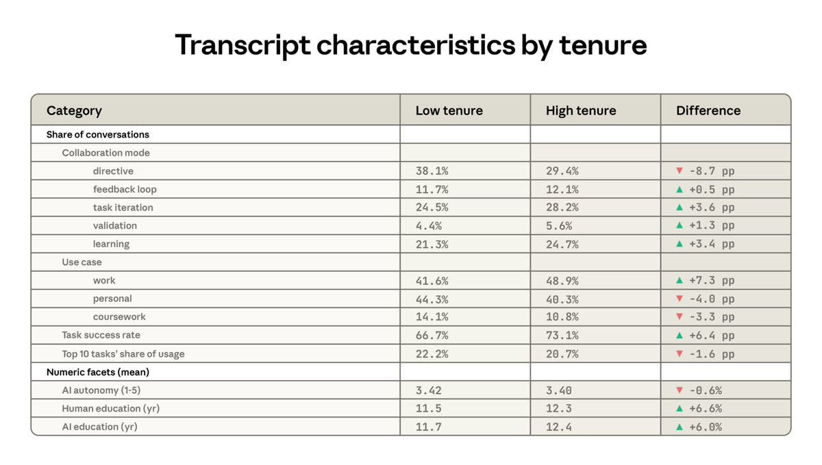 How does use change as users skill up? Longer term Claude users iterate more often and more carefully, and hand over full autonomy less, but the changes are small.