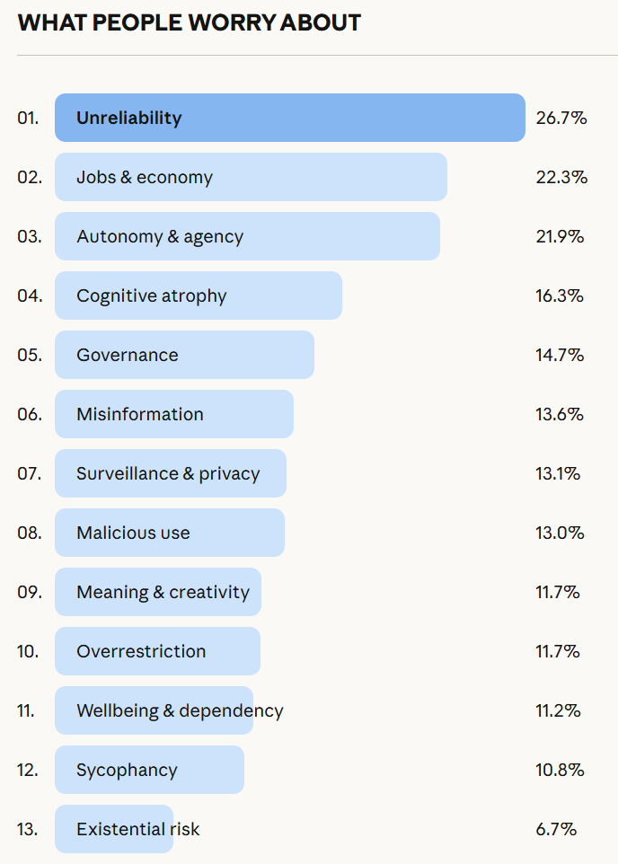 Anthropic: There was also a long tail of other concerns mentioned, e.g. concerns around bias and discrimination (5%), IP and data rights (4%), environmental costs (4%), harms to children and vulnerable groups (3%), democracy and political integrity (3%), or geopolitics (2%).