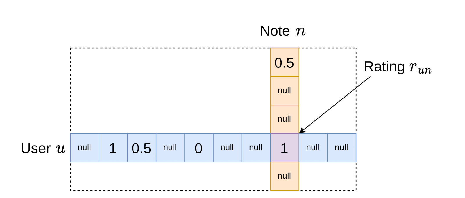 Users are invited to rate notes as either “not helpful,” “somewhat helpful,” or “helpful.” The results of all user-note pairs are recorded in a matrix r where each element run∈{0,0.5,1,null} corresponds to how user u rated note n. Users only rate a small fraction of notes, so most elements in the matrix are “null.” Non-null elements are called “observed” ratings, and values of 0, 0.5, and 1 correspond to the qualitative ratings of “not helpful,” “somewhat helpful,” and “helpful” respectively.