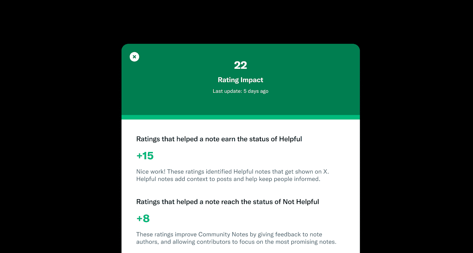 Users are the people who have permission to rate community notes. To get permission, a person needs to have had an account on X for more than 6 months, have a verified phone number, and have committed no violations of X’s rules. The rollout of community notes is slow, however, and so eligible account holders are only added to the Community Notes user pool periodically, and at random. New users don’t immediately get permission to write their own notes, having to first get a “rating impact” by rating existing notes (will explain this later).