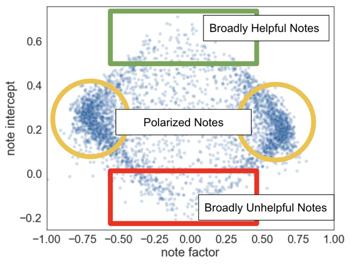 Factor vectors: First thing to note is that, to avoid overfitting, the factor vectors are currently just one dimensional (though they plan to increase the dimensions when they have more data). In practice, across all notes, this results in a spectrum where a negative factor roughly corresponds to the political left, and a positive factor corresponds to the political right (note that this spectrum was not hardcoded, but rather found automatically by the algorithm). This leaves a lot to be desired. In particular, because “consensus between the left and right” is used as a proxy for high-quality information, which might be good in some cases, but probably not for many others.[5] There are also plans to use multiple ranking models for different groups, though this seems mostly to be about dealing with geographic and linguistic diversity.[6]