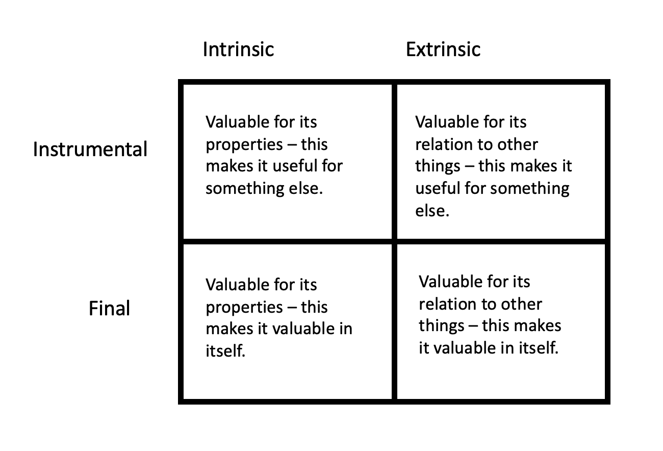 It’s worth naming some examples for how final (value for its own sake), instrumental (value as a means), intrinsic (value for inherent qualities), and extrinsic (value for qualities compared to others) values correlate.